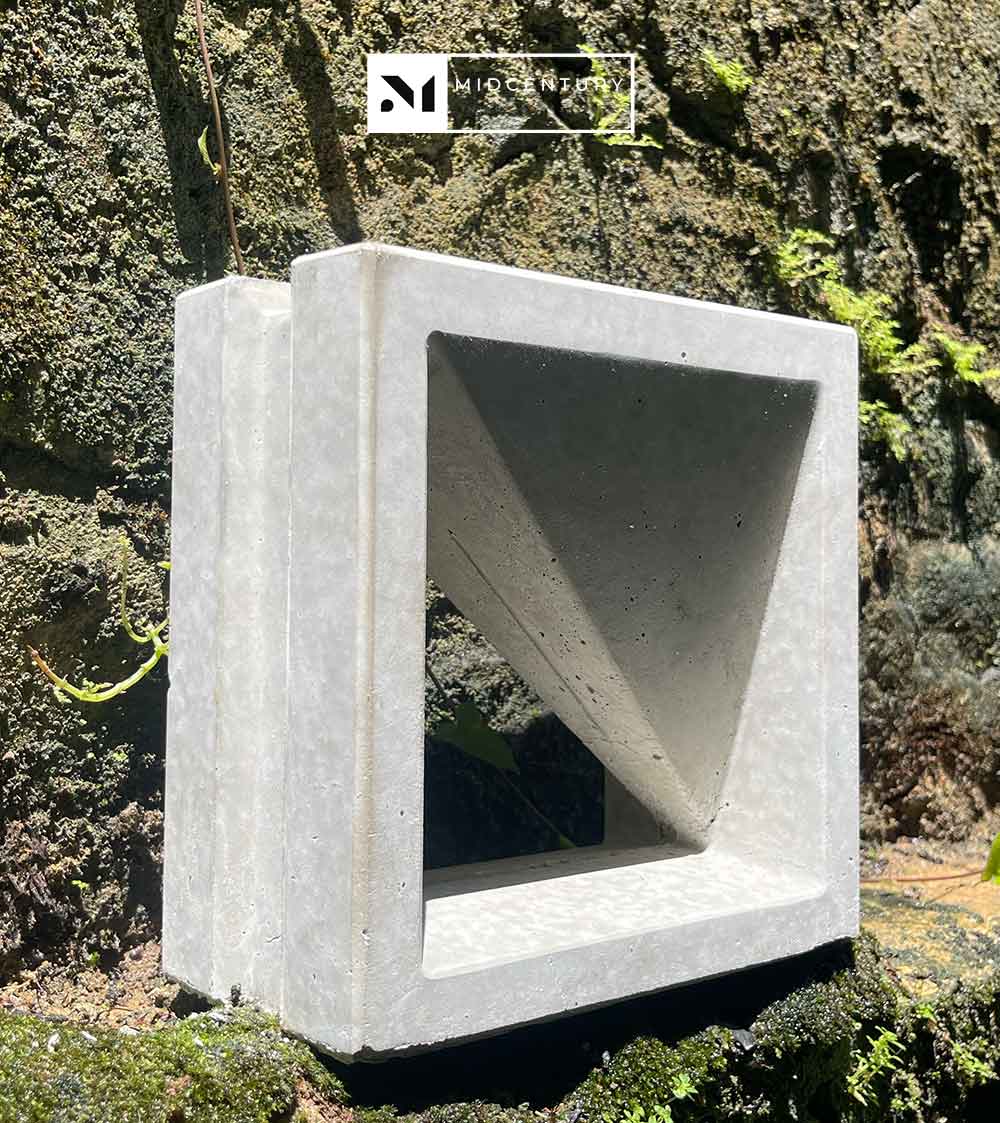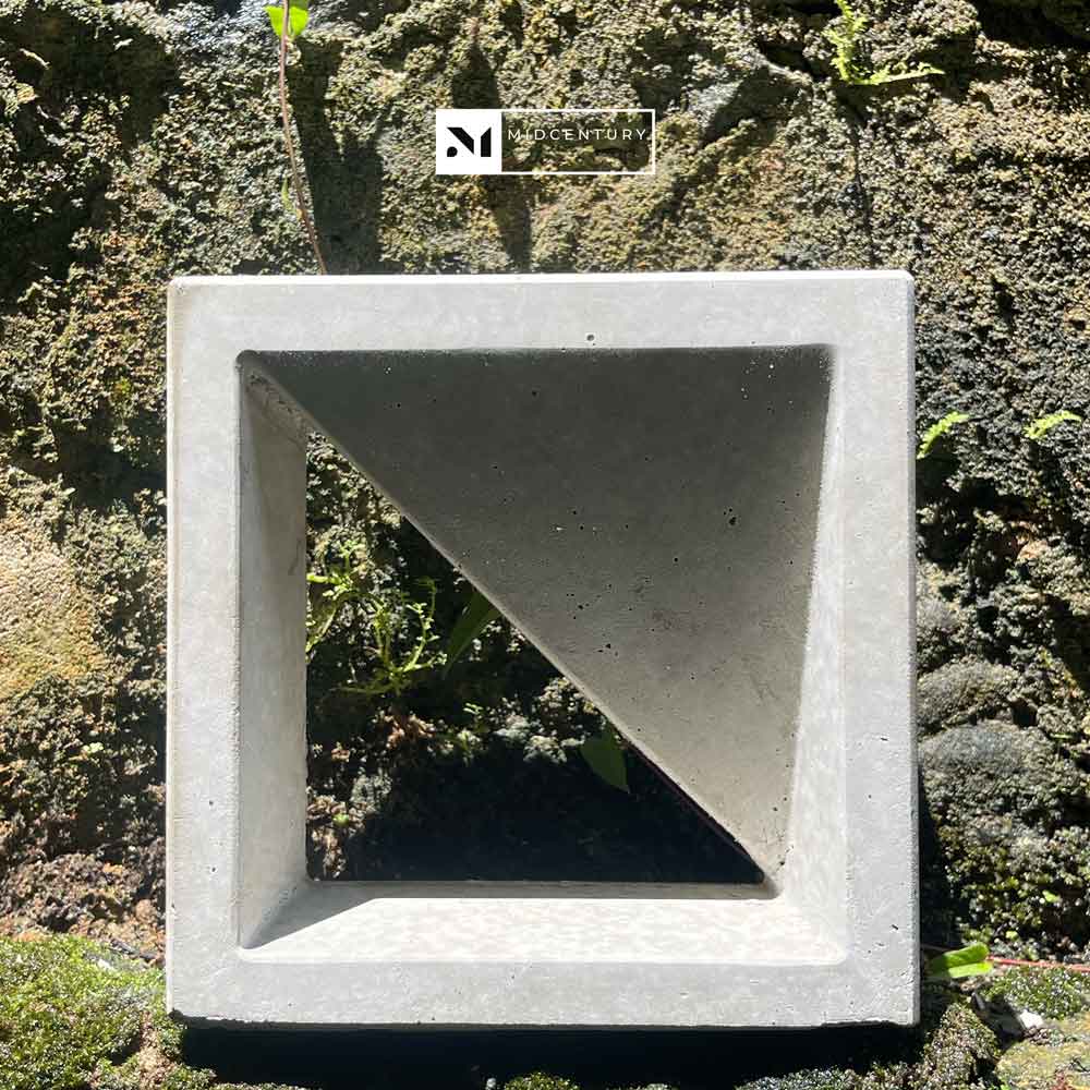 This double-sided breeze block features a single diagonal solid plane within a square frame, creating a clear directional expression that balances openness and enclosure. The angled form shapes light and airflow while introducing a strong architectural line that reads clearly from both sides.