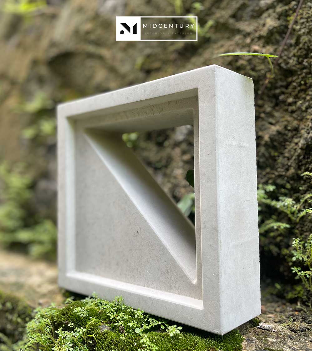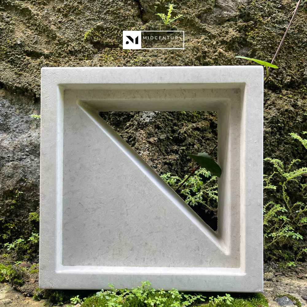 This single-sided breeze block features a bold triangular solid plane combined with a narrow diagonal opening, creating a strong architectural presence with controlled light and airflow. The composition emphasizes privacy while still allowing subtle ventilation and visual depth.