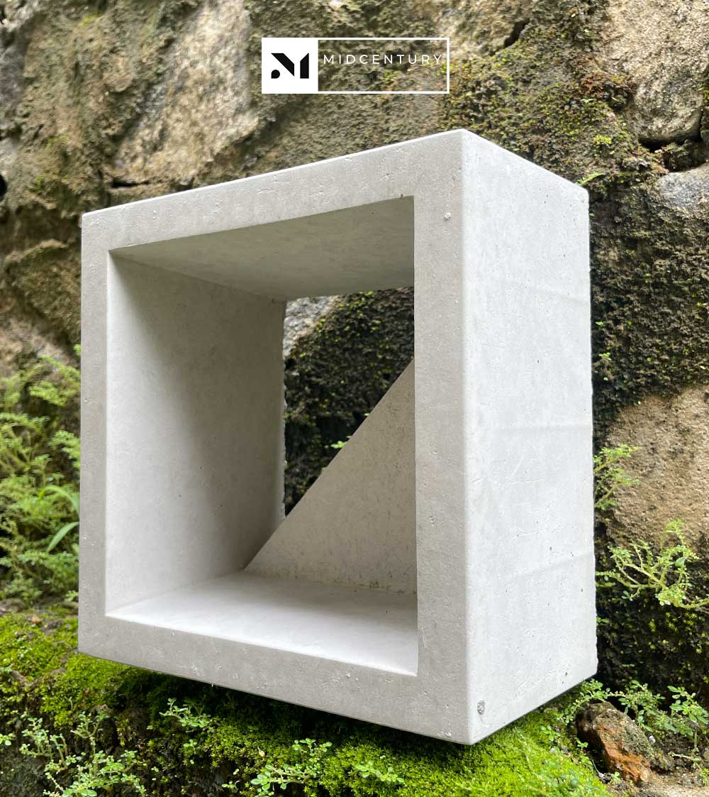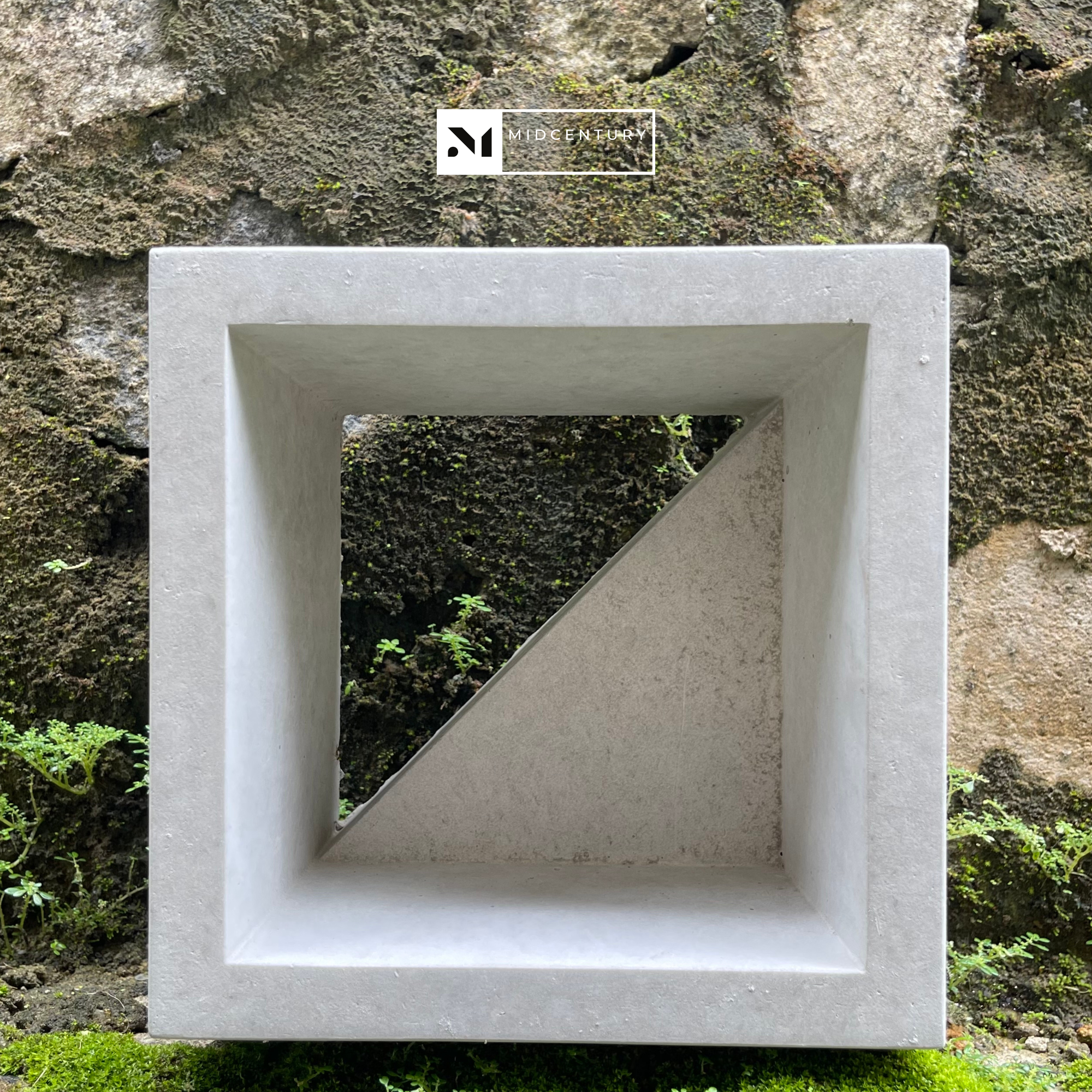 This single-sided breeze block features a diagonal internal plane set within a clean square frame, creating a dynamic interplay of light, shadow, and airflow. The angled surface adds visual movement while subtly directing ventilation and reducing direct visibility.