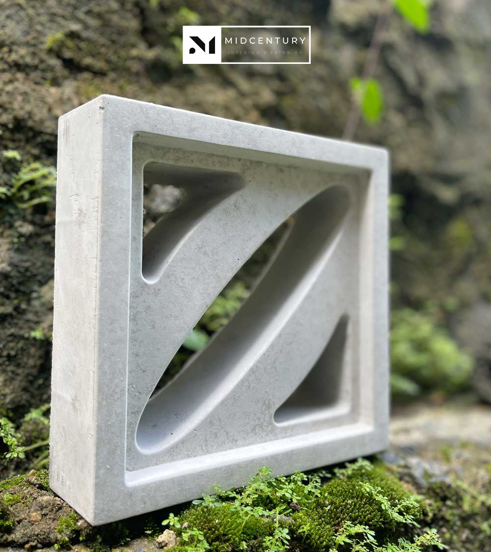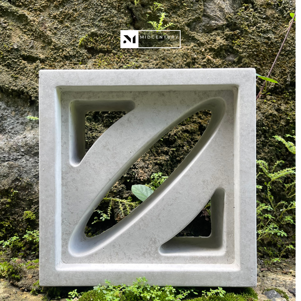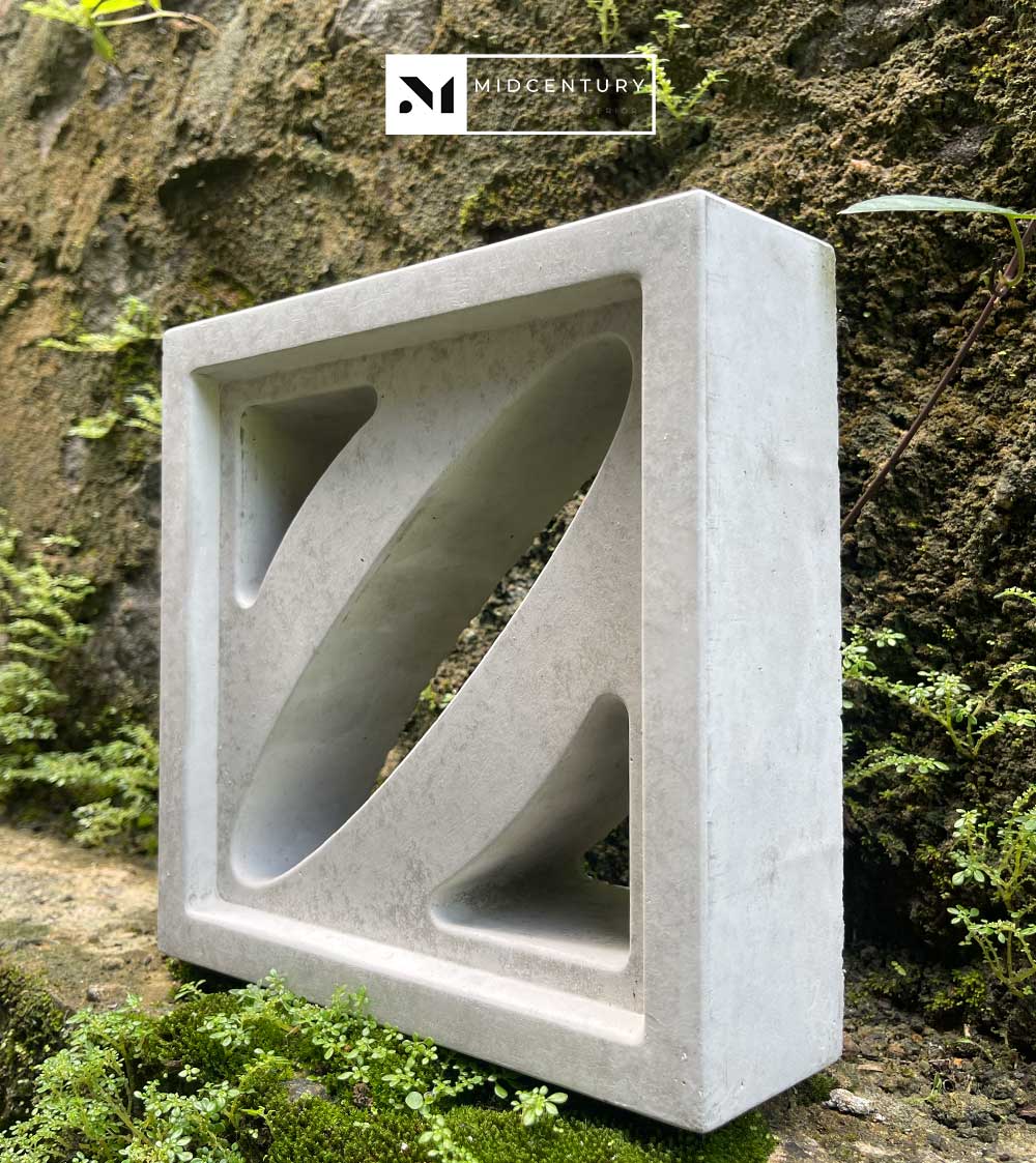 This single-sided breeze block features a continuous curved diagonal opening set within a clean square frame, creating a fluid movement of light, airflow, and shadow. The sweeping internal form softens the geometry while guiding ventilation and reducing direct visibility.